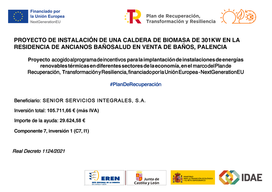 La Residencia de Mayores Bañosalud, situada en Venta de Baños (Palencia), gestionada por la empresa SENIOR SERVICIOS INTEGRALES, S.A., ha desarrollado un proyecto de instalación térmica, caldera de biomasa, que junto con la reciente instalación fotovoltaica que se ha realizado, permite que el edificio alcance la calificación “A”.